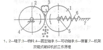 將破碎物料經給料口落入兩輥子之間,進行擠壓破碎,成品物料自然落下。遇有過硬或不可破碎物時,其輥子可憑液壓缸或彈簧的作用自動退讓,使輥子間隙增大,過硬或不可破碎物落下,從而保護機器不受損壞。相向轉動的兩輥子有一定的間隙,改變間隙,即可控制產品排料粒度。